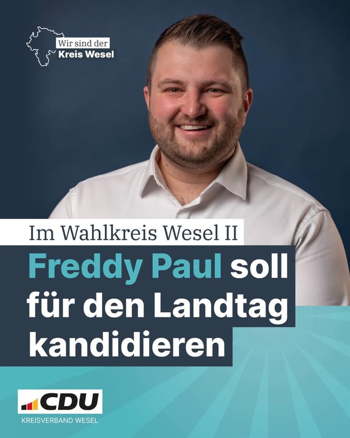Gemeinsam für den Niederrhein. 💪Die CDU-Verbände im Wahlkreis Wesel II haben einen gemeinsamen Vorschlag für die Landtagswahl 2027: Frederik "Freddy" Paul soll für Kamp-Lintfort, Voerde, Rheinberg, Xanten, Alpen und Sonsbeck ins Rennen gehen.Der 29-jährige Alpener steht für eine neue Generation von Politik ? engagiert, bodenständig und fest in unserer Region verwurzelt. Als Fraktionsvorsitzender in Alpen und Bezirksvorsitzender der Jungen Union Niederrhein bringt er nicht nur politische Erfahrung mit, sondern auch klare Überzeugungen und den Willen, Dinge vor Ort zu bewegen.Unser Ziel ist klar: Die Anliegen der Menschen in den sechs Städten und Gemeinden sollen in Düsseldorf stärker gehört werden ? mit Nachdruck, Verlässlichkeit und einer klaren Stimme.Die finale Entscheidung fällt Anfang Mai im Rahmen der Aufstellungsversammlung.Für uns ist schon jetzt klar: Freddy Paul ist ein guter Kandidat ? und ein starkes Zeichen für Aufbruch, Zusammenhalt und eine gelungene Zukunft für unsere Region!
