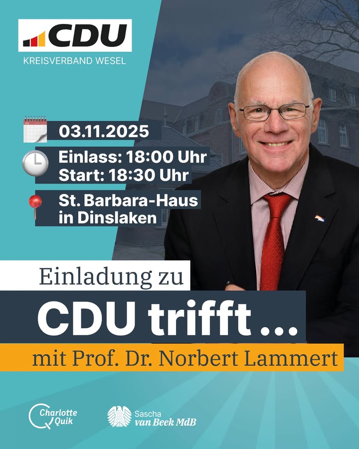 ✨ CDU trifft ... Prof. Dr. Norbert Lammert ✨Wir laden herzlich ein zu unserer nächsten Veranstaltung der Reihe "CDU trifft ..." in Dinslaken.📅 3. November 2025⏰ Einlass: 18:00 Uhr | Beginn: 18:30 Uhr📍 St. Barbara-Haus (Licht- und Lohnhalle), Hünxer Straße 380, 46537 DinslakenAls Festredner begrüßen wir Prof. Dr. Norbert Lammert, Vorsitzender der Konrad-Adenauer-Stiftung e.V. und ehemaliger Präsident des Deutschen Bundestages. 🇩🇪Nach dem offiziellen Teil laden wir zu einem gemütlichen Ausklang mit Imbiss und Getränken ein. 🥂🍴#CDUtrifft #CDU #Dinslaken #NorbertLammert #KonradAdenauerStiftung